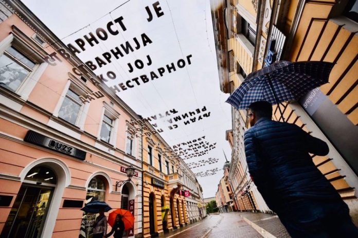 “U budućnost treba ići, u budućnost gledaju i idu svi srećniji narodi”, “Ako tražite sreću za druge, naći ćete je i za sebe”, “Stvarnost je stvarnija ako joj daš nestvarno”, samo su neke od poruka iznad glava prolaznika.