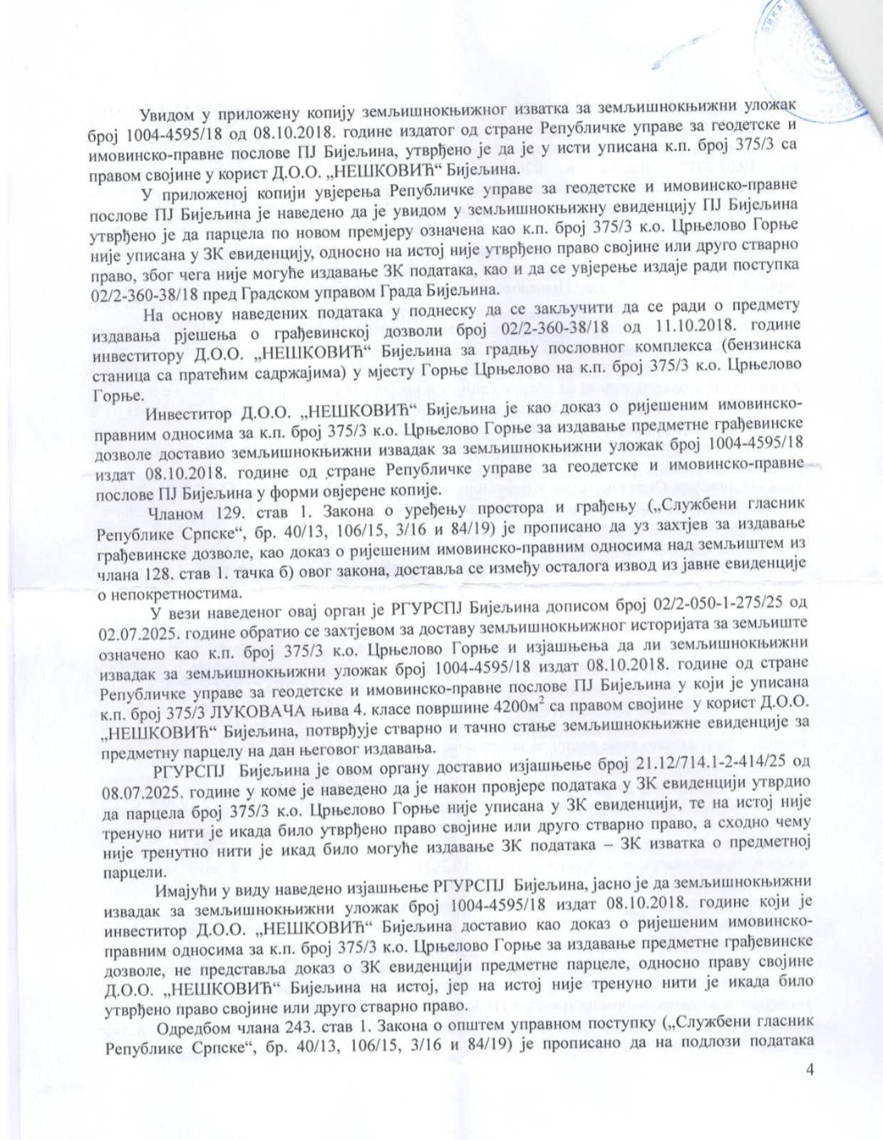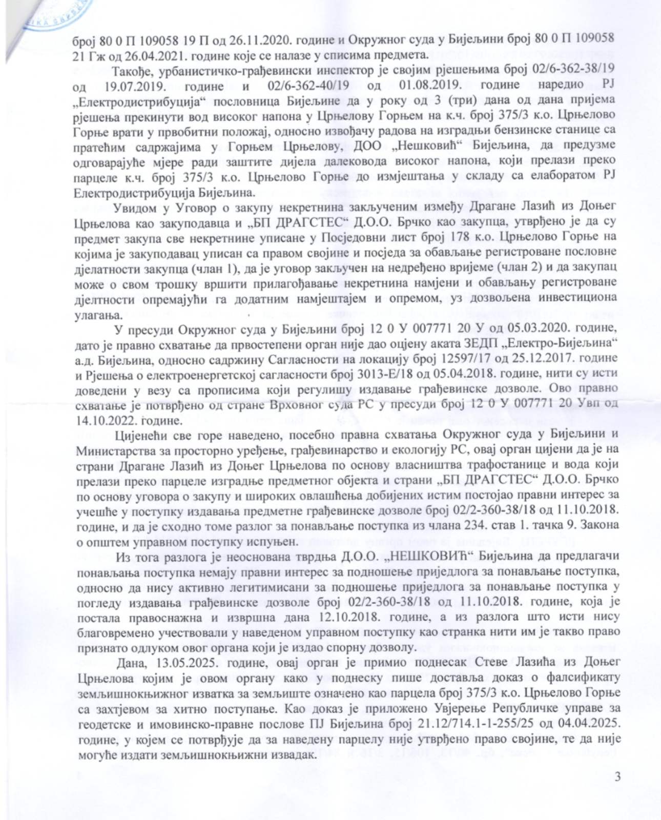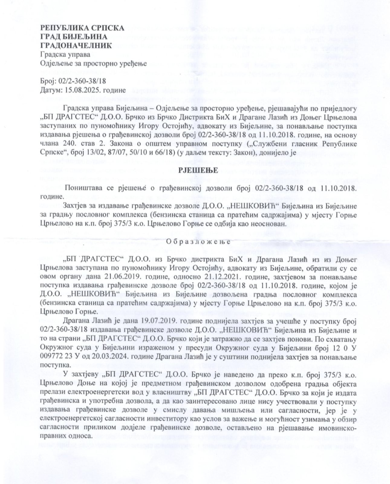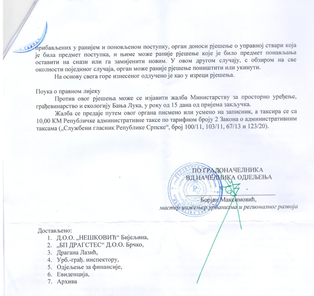 Odjeljenje za urbanizam Gradske uprave Grada Bijeljina donijelo odluku o poništenju dozvole preduzeću DOO „Nešković“ za benzinsku pumpu u Crnjelovu.
