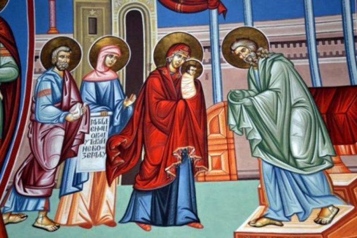 U pitanju je prvi susret Boga i čoveka pod svodovima jerusalimskog hrama i sretenje novorođenog Mesije koga je u naručje primio pravedni starac, poznat kao sveti Simeon Bogonosac.