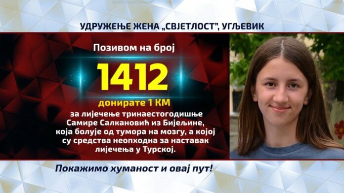 Udruženje žena “Svjetlost“ iz Ugljevika pokrenulo je humanitarnu akciju za prikupljanje sredstava za liječenje trinaestogodišnje Samire Salkanović iz Bijeljine, koja se suočava sa teškom bolešću – tumorom na mozgu.