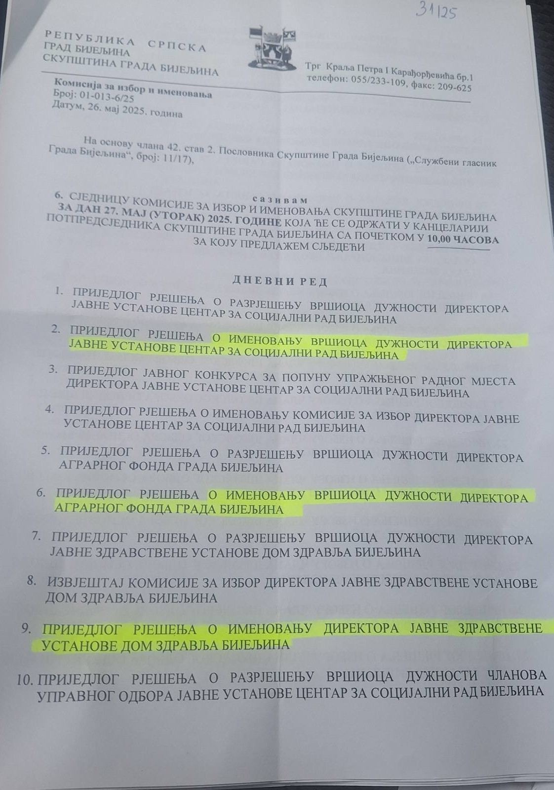 Jedna od tačaka Dnevnog reda a u okviru izvještaja Komisije za izbor imenovanje je i imenovanje direktora Doma zdravlja Bijeljina.