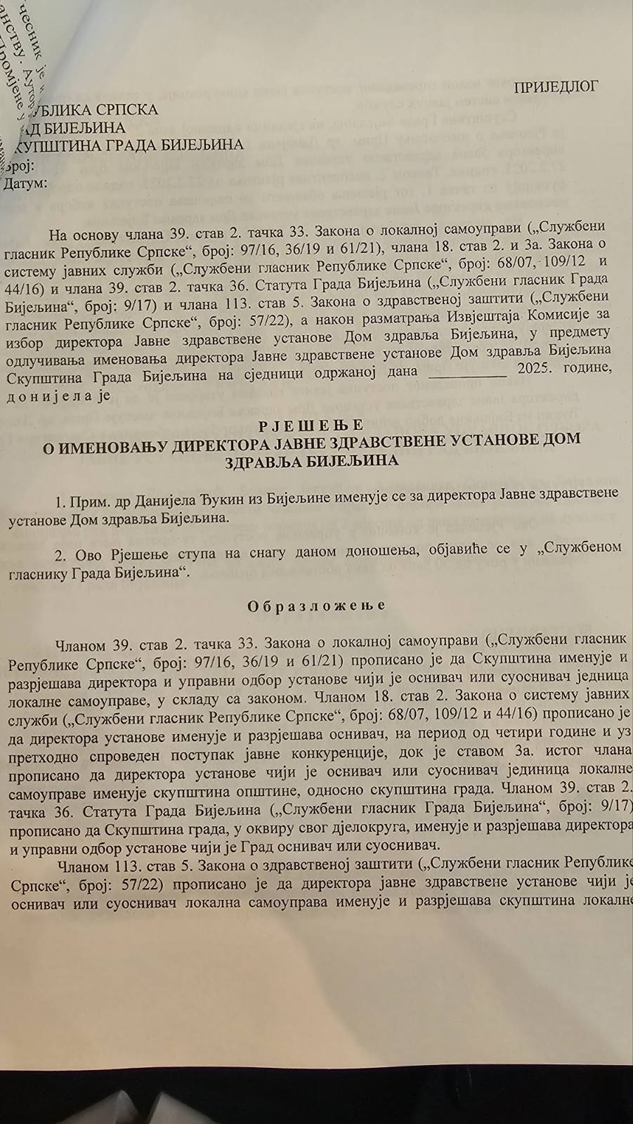Nakon održane 6. sjednice Komisije za izbor i imenovanja na kojoj je usaglašen prijedlog da se na mjesto direktora Doma zdravlja Bijeljina nakon sprovedene konkursne procedure na četvorogodišnji mandat imenuje prim. dr Danijela Đukin iz Bijeljine koja je bila i jedini kandidat na konkursu isti je usvojen od strane odbornika SG Bijeljina.